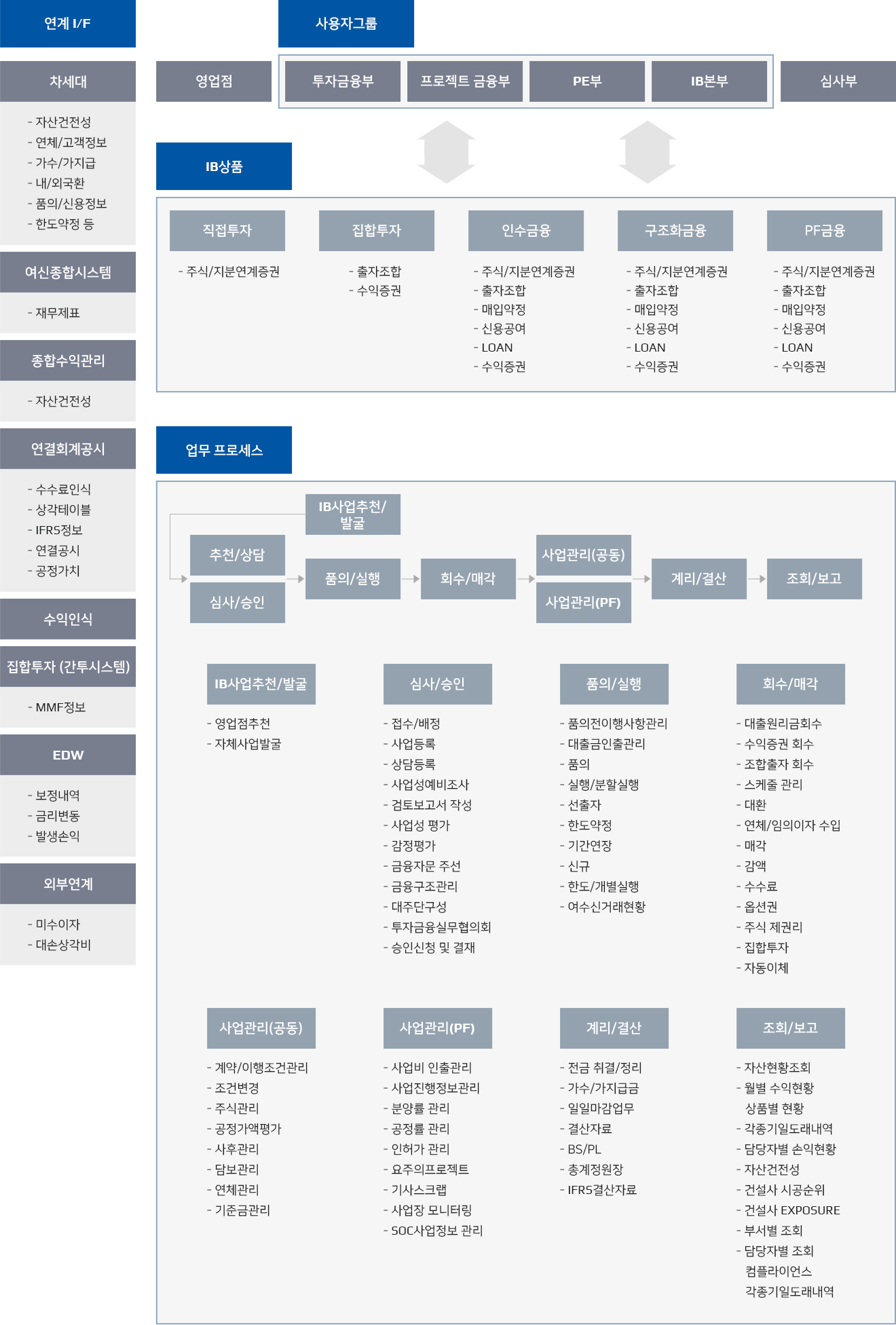 - IB업무의 핵심이라고 할 수 있는 중장기적 기업투자 및 프로세스 기반의 기업 금융의 Back Office 구축은 IBK가 유일한 수준