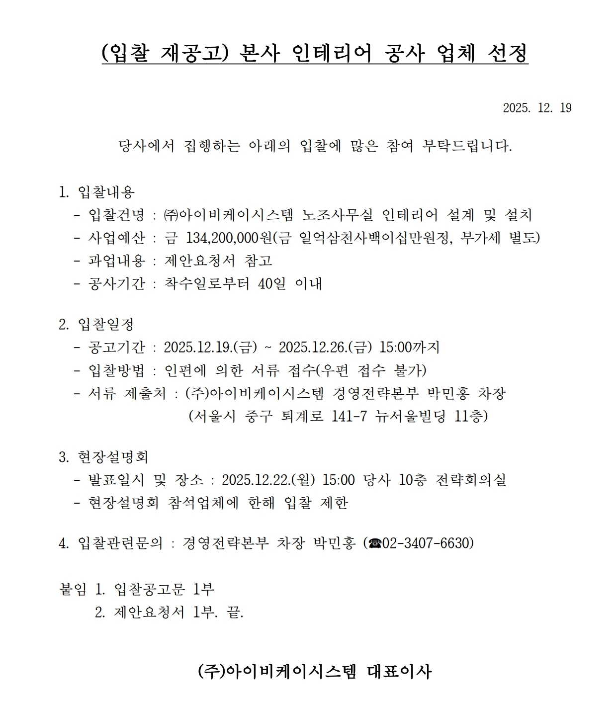 | 제목[입찰재공고] 본사 인테리어 공사 업체 선정 |